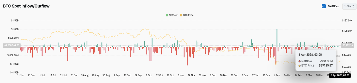 Спотовые потоки также отражают скрытую осторожность, поскольку оттоки доминируют большую часть недавнего периода. Эта тенденция указывает на продолжающееся давление на продажи и ограниченное накопление.