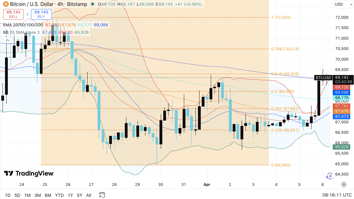 Техническая картина показывает, что Биткоин сжимается в сужающемся диапазоне между $67,000 и $69,500. Кроме того, сжатие EMA и ужесточение полос Боллинджера указывают на предстоящее расширение волатильности. В результате цена вскоре может решительно прорваться в одну сторону.
