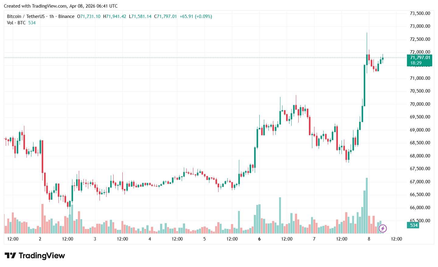 Вечером 7 апреля 2026 года США и Иран заключили соглашение о прекращении огня на две недели, что подтвердил президент Дональд Трамп. На фоне этого фондовый и криптовалютный рынки отметились положительной динамикой, биткоин, в частности, пробил уровень в $72 000.