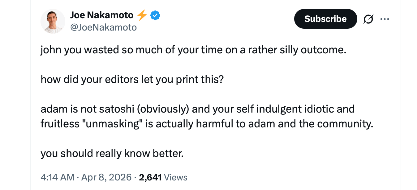 «Такой бессмысленный журнализм, направленный на разоблачение, делает реального человека огромной мишенью, не принося абсолютно никакой общественной пользы», — ответил один человек на статью журналиста. «Мы уже видели, как это выглядит, когда семья Хэла Финни подвергалась преследованиям и страхам после предыдущих волн спекуляций о Сатоши. Если твой случай начинается и заканчивается словами «те же круги, тот же словарный запас, та же эпоха», это не столько откровение, сколько фанфик с потенциальным побочным ущербом. Иди на х**, Джон».