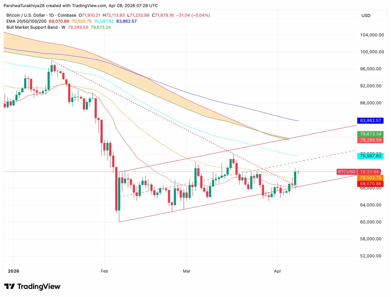 $BTC торгуется на уровне $71 879 8 апреля, немного откатившись от трёхнедельного максимума в $72 738 после того, как США и Иран договорились о двухнедельном прекращении огня. Все четыре EMA по-прежнему снижаются, при этом 20-дневная стоимость $69,070 пока остаётся единственной.