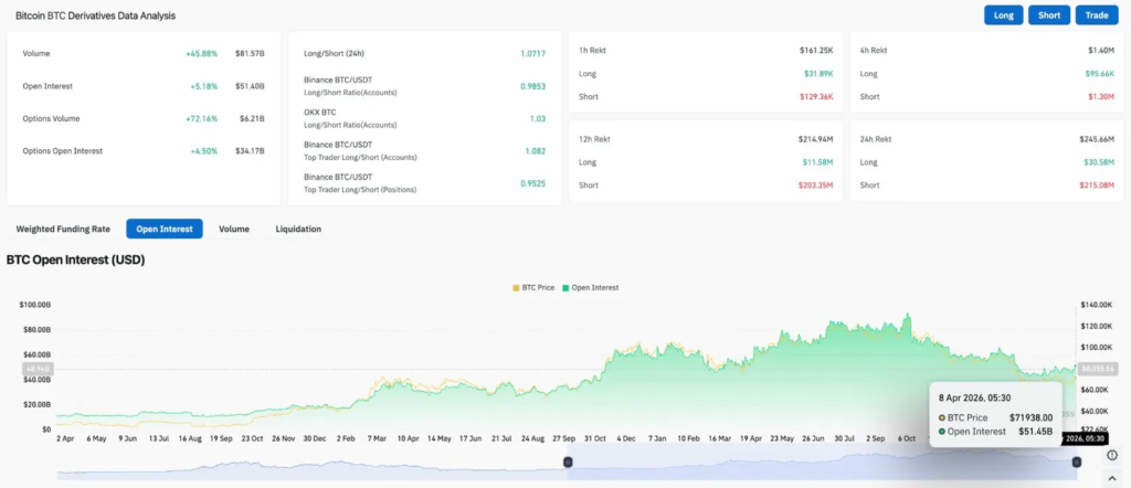 Соотношение 24-часовой долгий и короткий срок составляет 1,0717, с небольшим уклоном в сторону длины. За 24 часа шорты потеряли 215,08 млн долларов на ликвидациях против всего 30,58 миллиона долларов по длинным позициям. Это соотношение 7 к 1 подтверждает, что перемирие было настоящим коротким сокращением. Данные за 12 часов рассказывают ту же историю: 203,35 млн долларов в коротких ликвидациях против 11,58 миллиона долларов по длинным позициям. Продавцы пострадали в этом деле, и OI на уровне $51,40 млрд ещё имеет потенциал для роста по сравнению с пиками $80B+ в конце 2024 года.