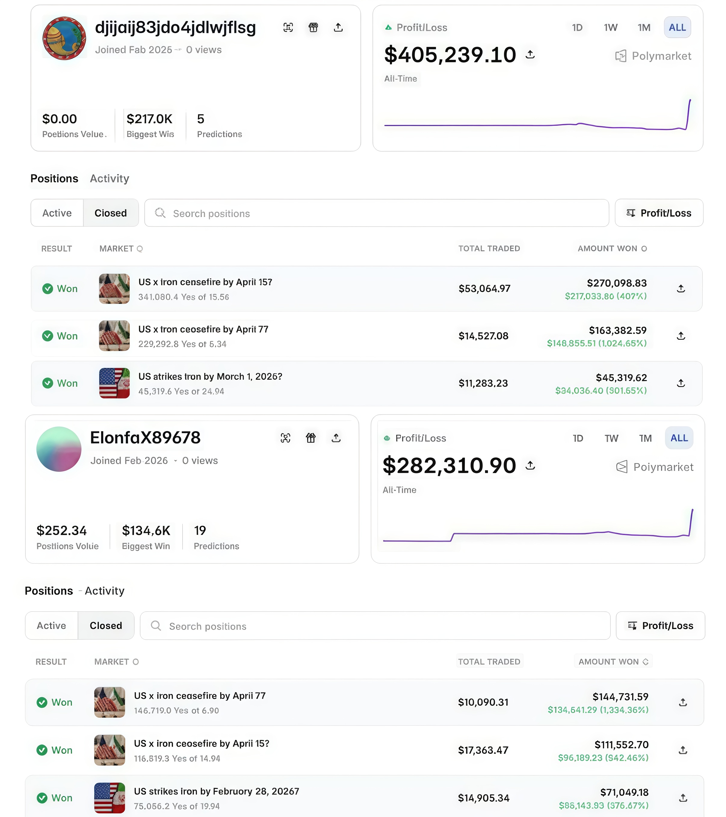 Этот же кластер аккаунтов ранее монетизировал другую закрытую информацию, безошибочно предсказав внезапную атаку США на Иран 28 февраля 2026 года.