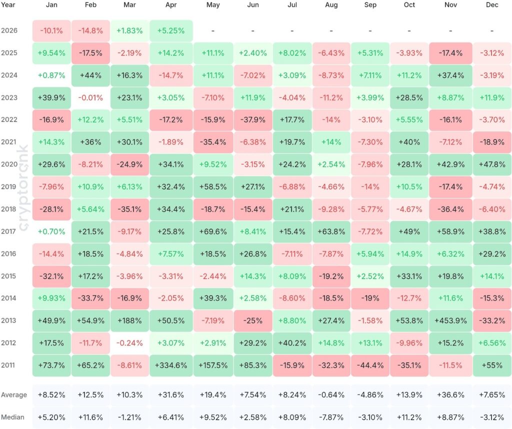 Тем временем структурная картина биткоина неоднозначна. Биткоин-ETF зафиксировали чистые притоки в размере 1,32 миллиарда долларов в марте, положив конец четырём подряд месяцам оттока. Это восстановление сигнализирует о возобновлении институционального интереса. Исторически апрель считается самым сильным месяцем в истории Биткоина, заканчиваясь зелёным в 10 из последних 15 лет.