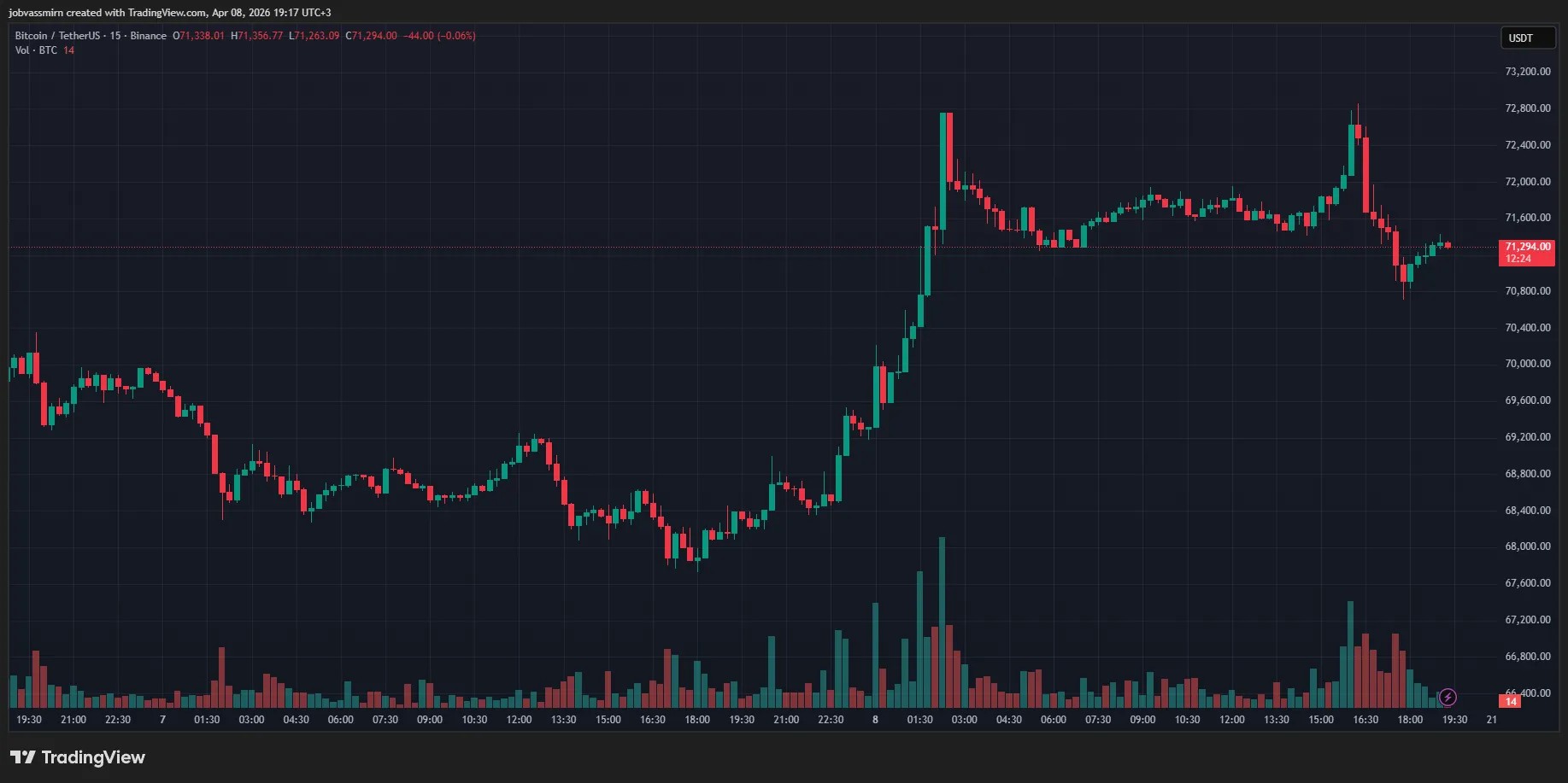На момент написания биткоин торгуется чуть выше $71 000. За сутки актив прибавил 5% на фоне деэскалации на Ближнем Востоке.