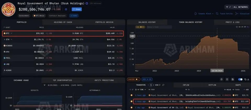 Всего с начала 2026 года Бутан вывел из госрезерва более 559 $BTC на сумму около $41 млн. За три месяца королевство совершило как минимум пять сделок, самая крупная, по сведениям Arkham, произошла в конце марта: Бутан перевел из резерва 519,707 $BTC стоимостью примерно $36,75 млн.