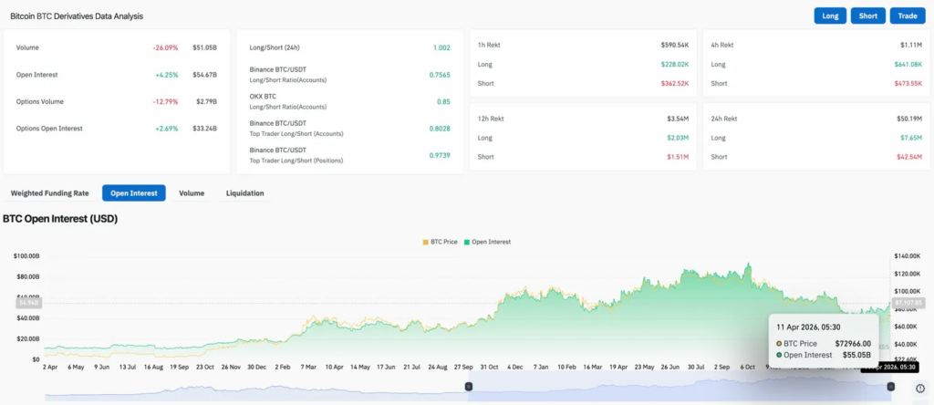 Объём объёмов снизился на 26,09% до $51,05 млрд, а OI вырос на 4,25% до $54,67 млрд. Позиции удерживаются, а не накапливаются. Соотношение длинных и коротких позиций на уровне 1.002 остаётся стабильным, при этом аккаунты Binance имеют предвзятость на уровне 0.7565, а OKX — 0.85.
