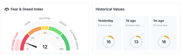 Индекс страха и жадности упал с 16 до 12 пунктов, сохранив позиции в зоне экстремального страха.