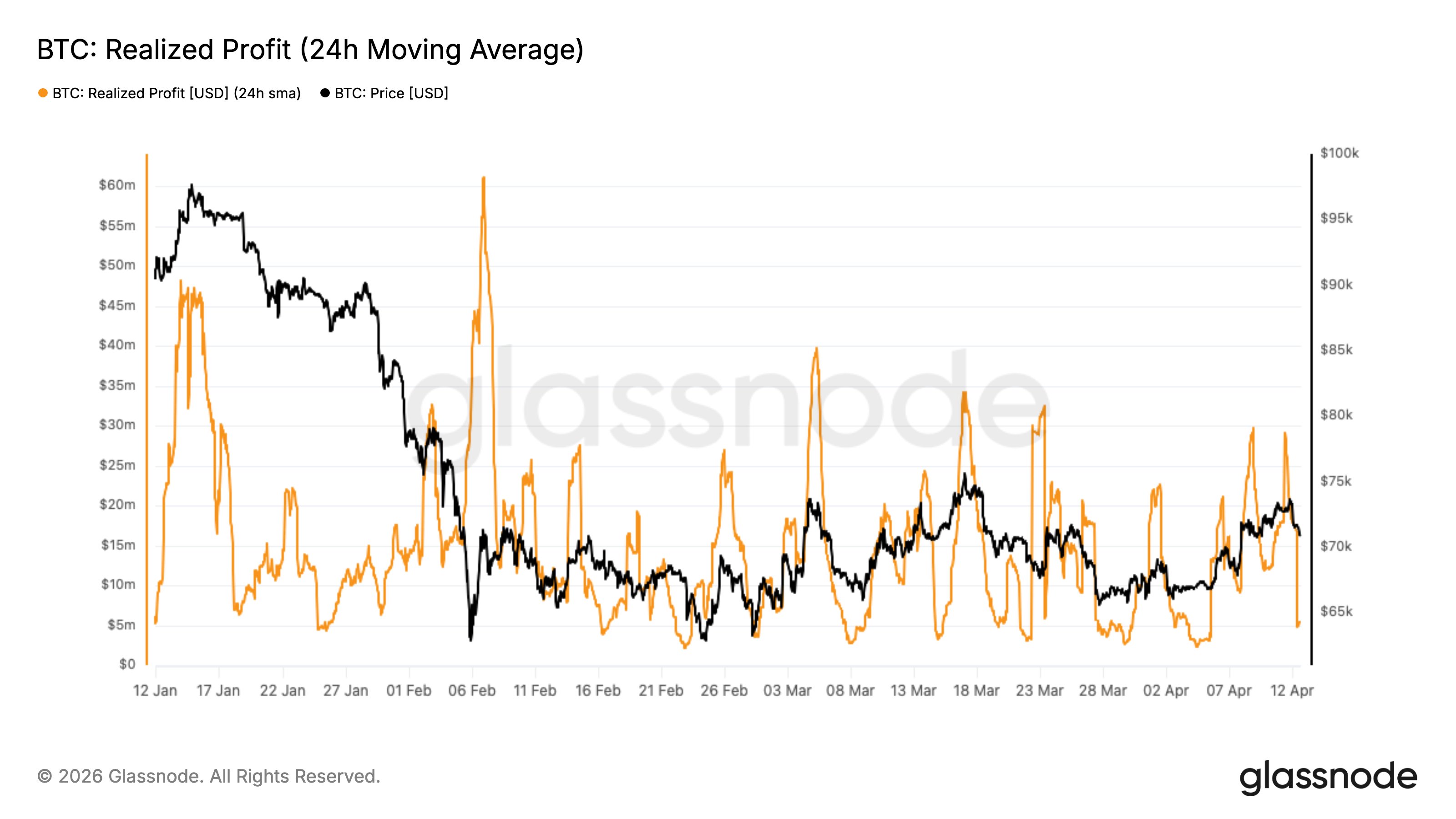 В Glassnode констатировали, что каждый подход цены к уровням выше $70 000 сопровождается усилением настроя на фиксацию прибыли. По их расчетам, в последний раз часовые темпы достигли $20 млн. При курсе в $70 800 13,5 млн $BTC несли для держателей «бумажные убытки», что ограничивает отскок.