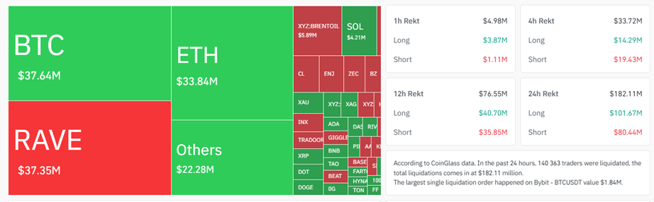 По данным Coinglass, за последние 24 часа ликвидации лонгов по биткоину составили $29,4 млн, шортов — $8,2 млн.