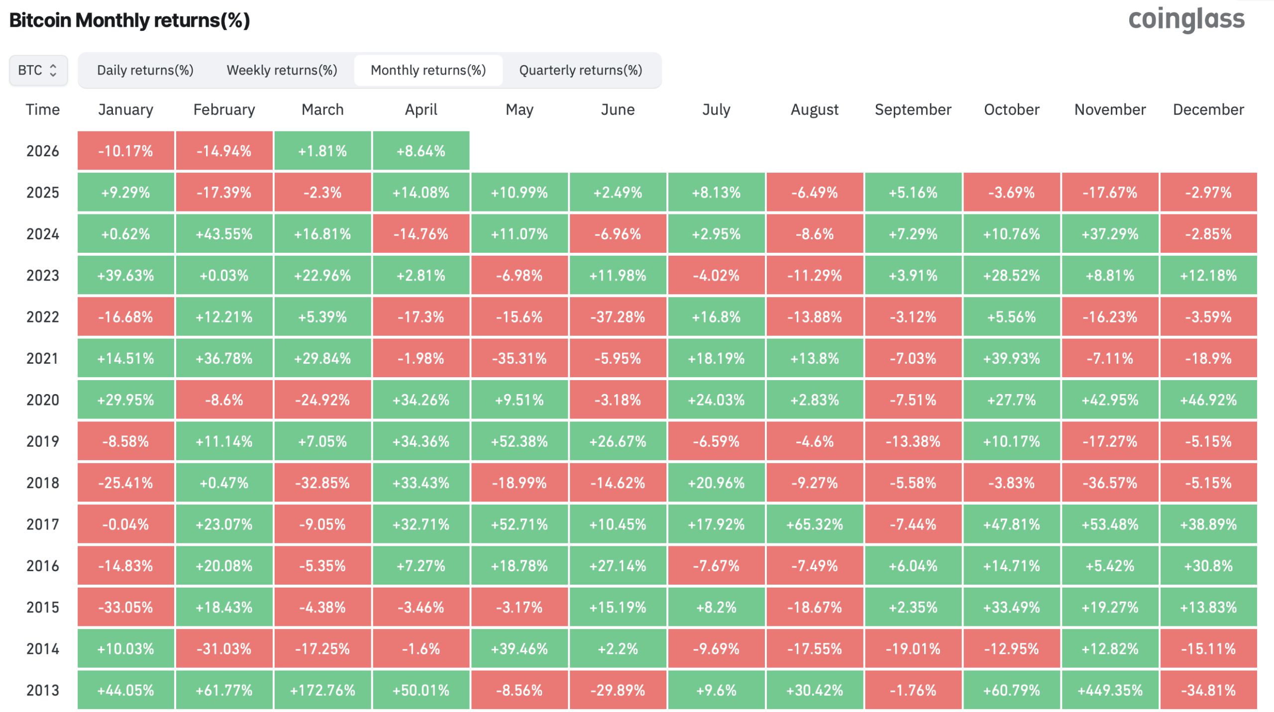 Исторически апрель был благоприятным месяцем для биткойна. С 2013 года биткойн закрывал апрель с ростом примерно в 69% случаев. 2026 год оказался нестабильным, на что повлияли постоянные макроэкономические трудности и последствия прошлогоднего падения цен. На данный момент во втором квартале 2026 года биткойн вырос на 8,64%.