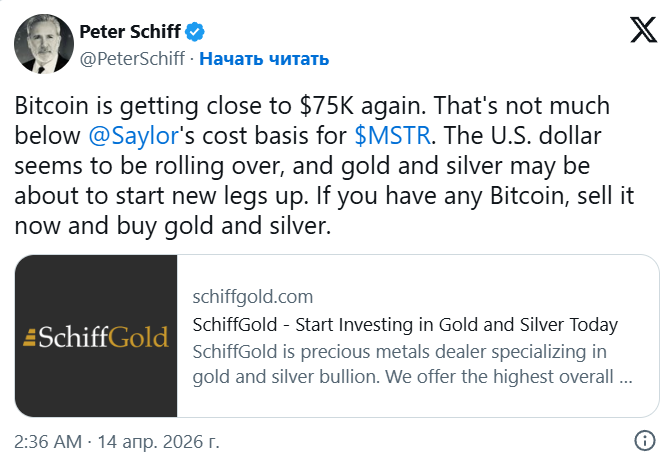 Заявление Шиффа прозвучало на фоне восстановления рынка криптовалют. За последние сутки биткоин подорожал более чем на 5,30% до $74,594, за неделю прирост составил почти 8%, по данным CoinMarketCap.