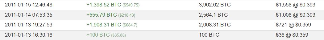 Они были переведены с другого кошелька, открытого 15 лет назад. Все биткоины были внесены на адрес с 13 по 15 января 2011 года. Курс монет в те дни составлял $0,359–0,393 и в общей сложности они стоили $1,4 тыс.
