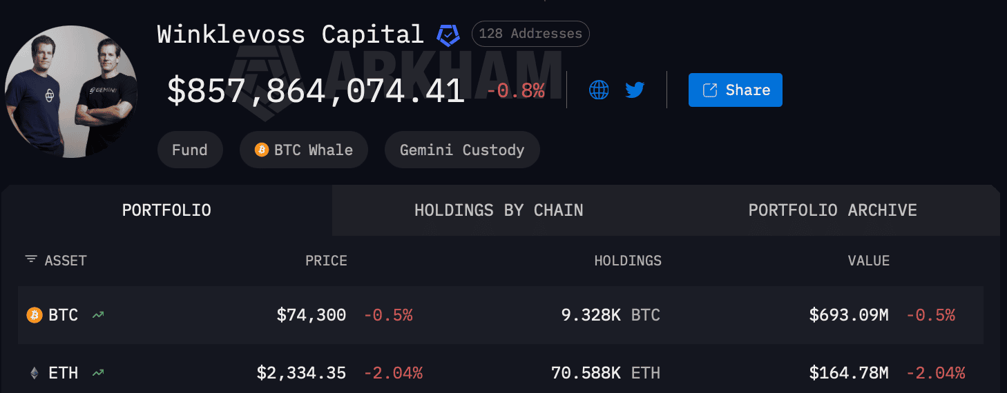 - Сумма криптоактивов в портфеле инвестиционной компании братьев Винклвоссов достигла почти $858 млн.
