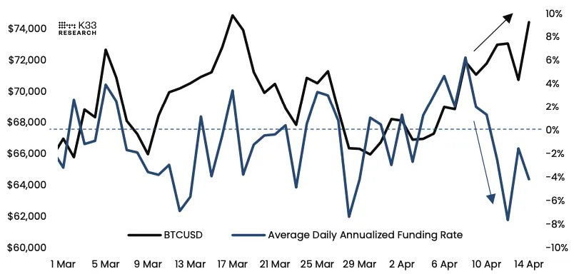Отрицательная ставка финансирования на рынке деривативов при росте котировок первой криптовалюты создает условия для шорт-сквиза. Об этом заявили аналитики K33.