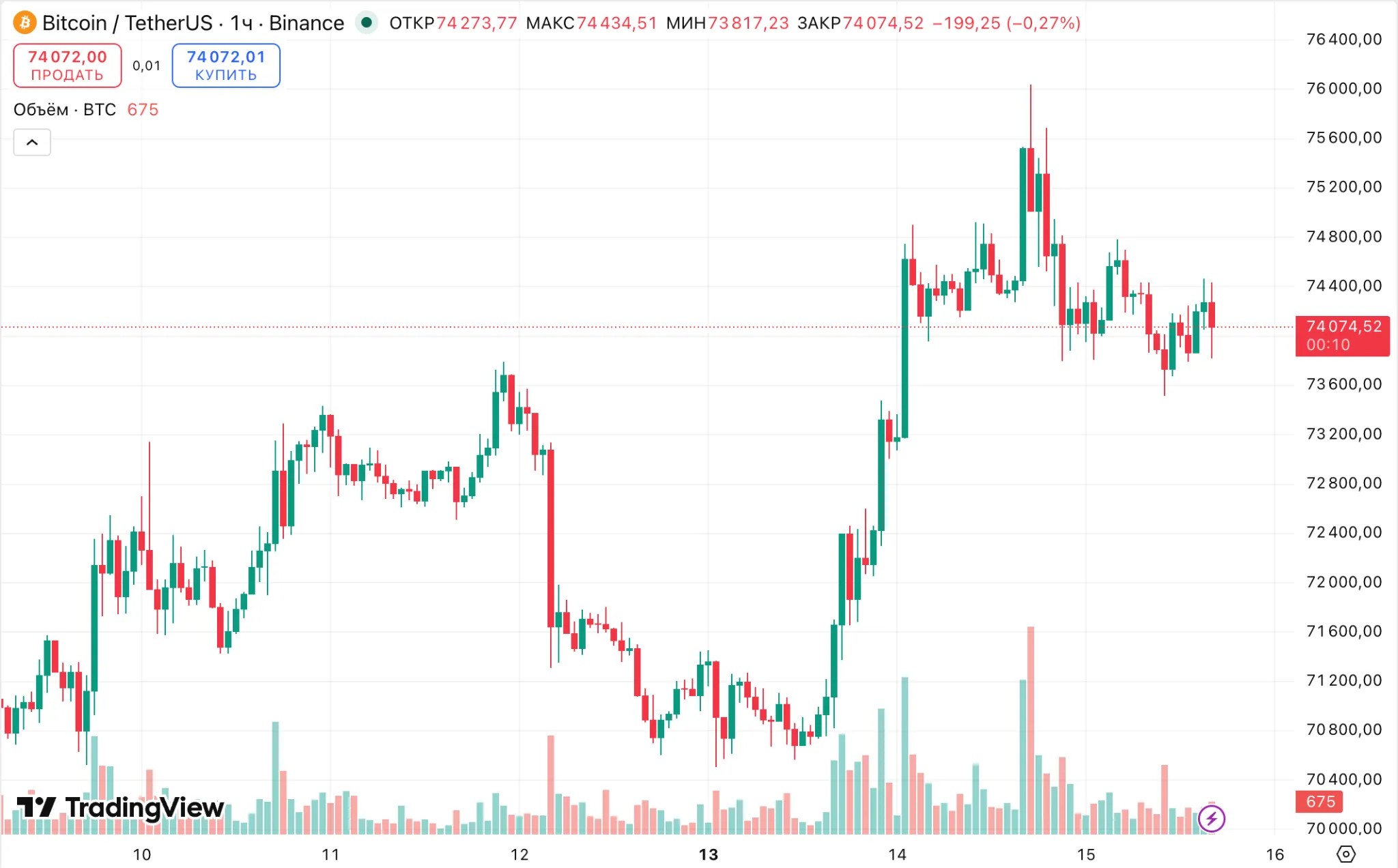 На момент написания биткоин торгуется около $74 000. За последние сутки цена актива снизилась на 1,9%.