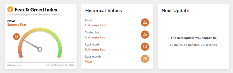 Индекс страха и жадности остался на 23 пунктах, сохранив позиции в зоне экстремального страха.