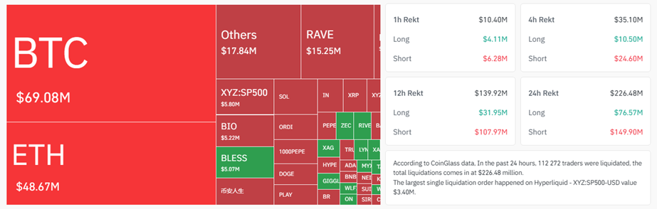 По данным Coinglass, за последние 24 часа ликвидации шортов по биткоину составили $48,7 млн, более чем вдвое превысив ликвидации лонгов ($20,4 млн).