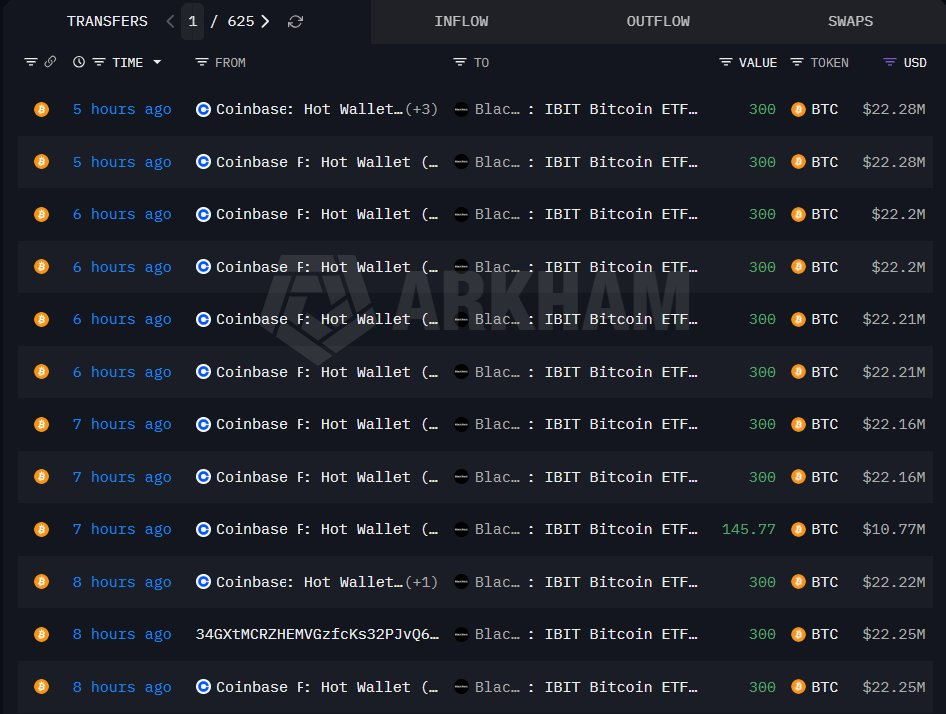 Данные о блокчейне, отмеченные Onchain Lens, показывают, что BlackRock снял с Coinbase 3 446 $BTC на сумму $255,2 миллиона. Транзакции, в основном, в основном партиями по ~300 $BTC, направлялись напрямую в кошельки с маркировкой iShares Bitcoin ETF (IBIT).