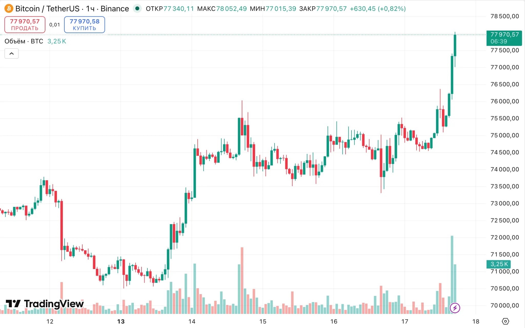 На момент написания биткоин торгуется около $77 900. За последние сутки курс цифрового золота вырос на 5%.
