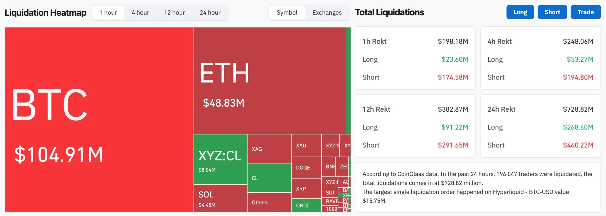 На фоне роста котировок объем ликвидаций почти достиг $200 млн за час. Большая часть — $171 млн — пришлась на короткие позиции. Суточный показатель достиг $728 млн.