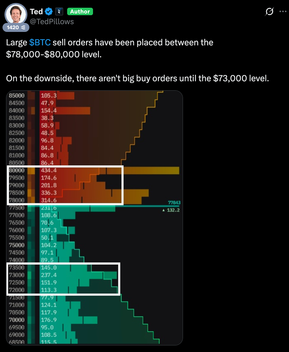 зона сопротивления ($78 000-80 000). Данные по ликвидности показывают скопление крупных лимитных заявок на продажу. Пройти этот блок без дополнительного торгового объема будет сложно, чем и объясняется локальная пауза в росте;
