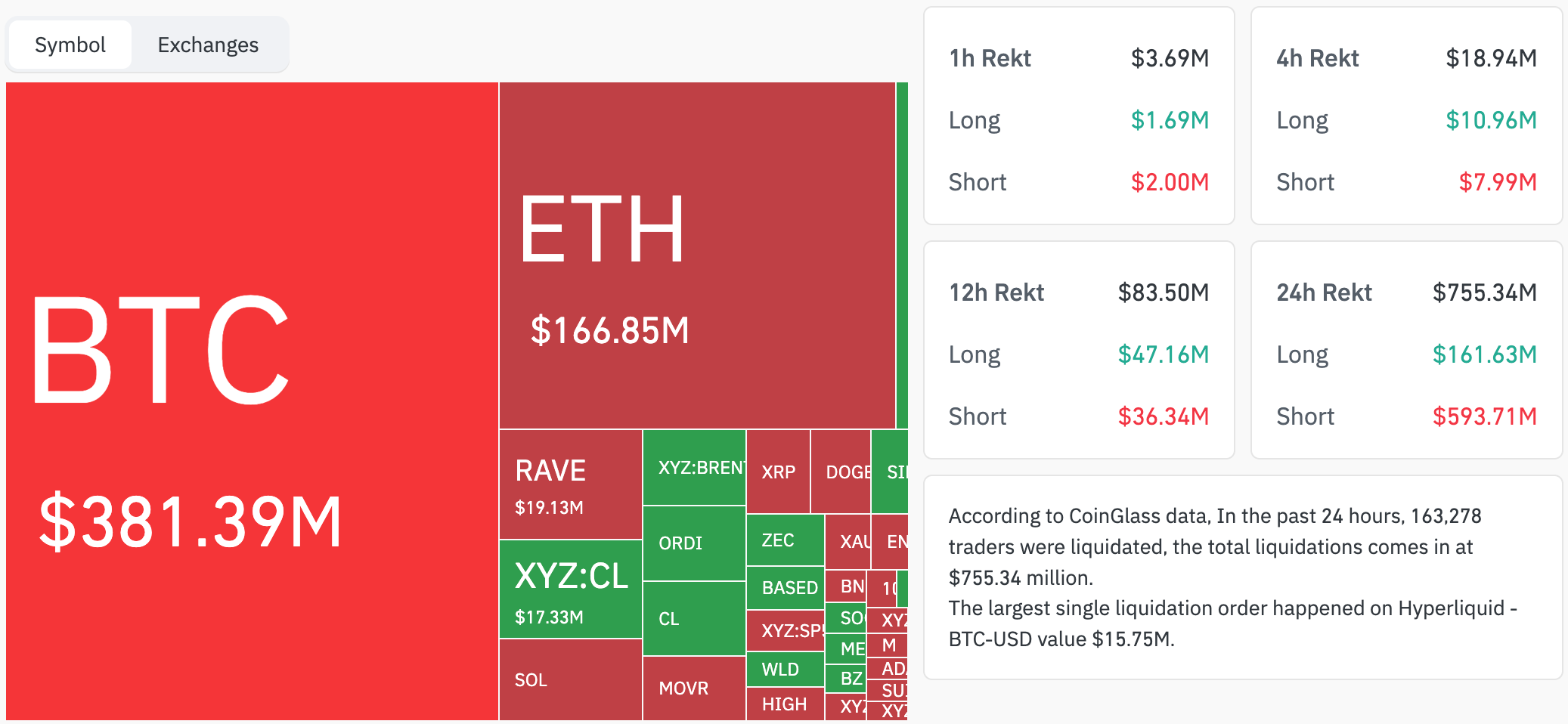 Суточный объем ликвидаций на крипторынке достиг $755 млн. За последние 24 часа принудительно закрыты позиции 163 031 трейдеров.