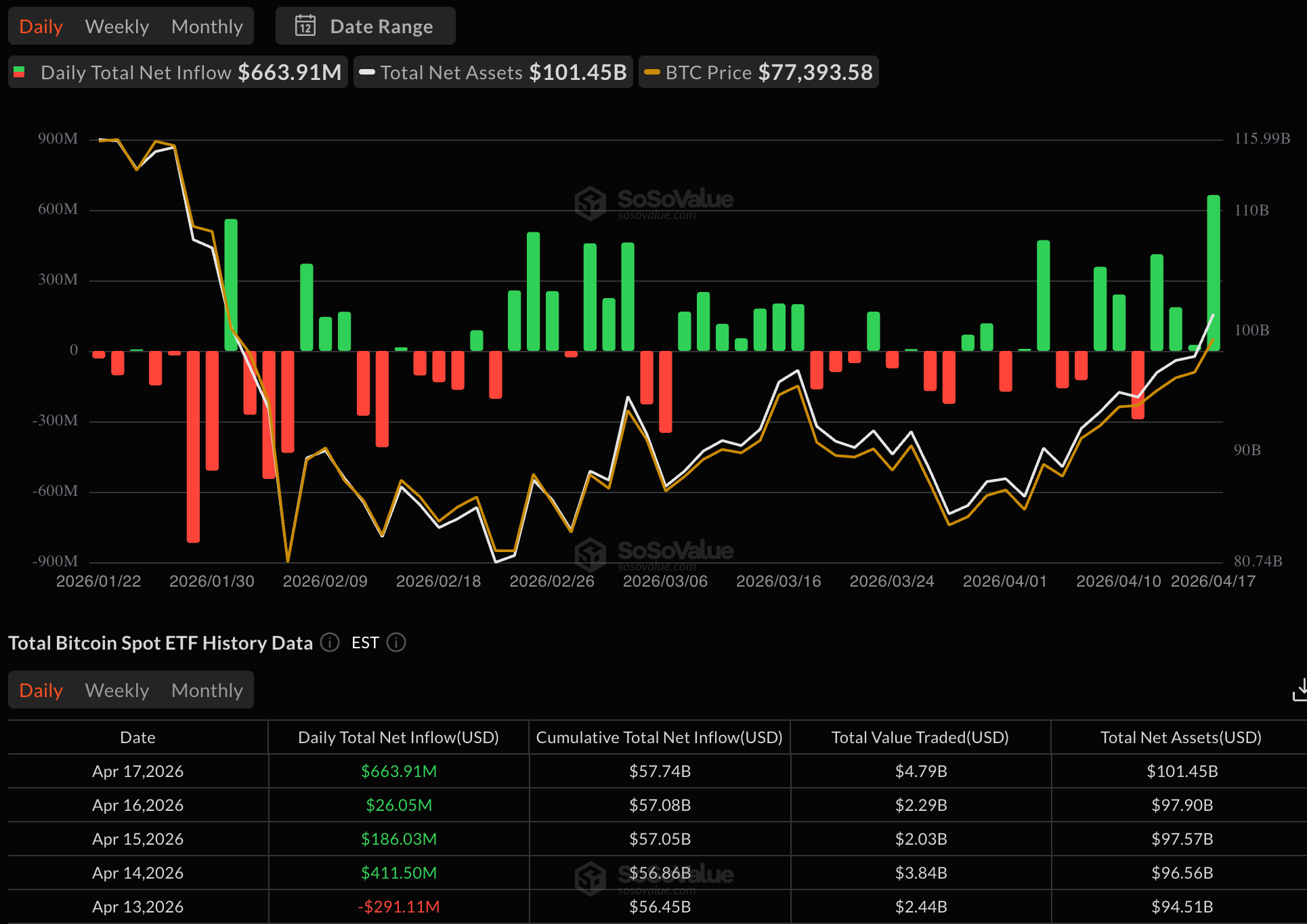 По итогам торгов 17 апреля чистый приток в спотовые ETF составил $663,91 млн. В последний раз столь высокие показатели фиксировались в январе.