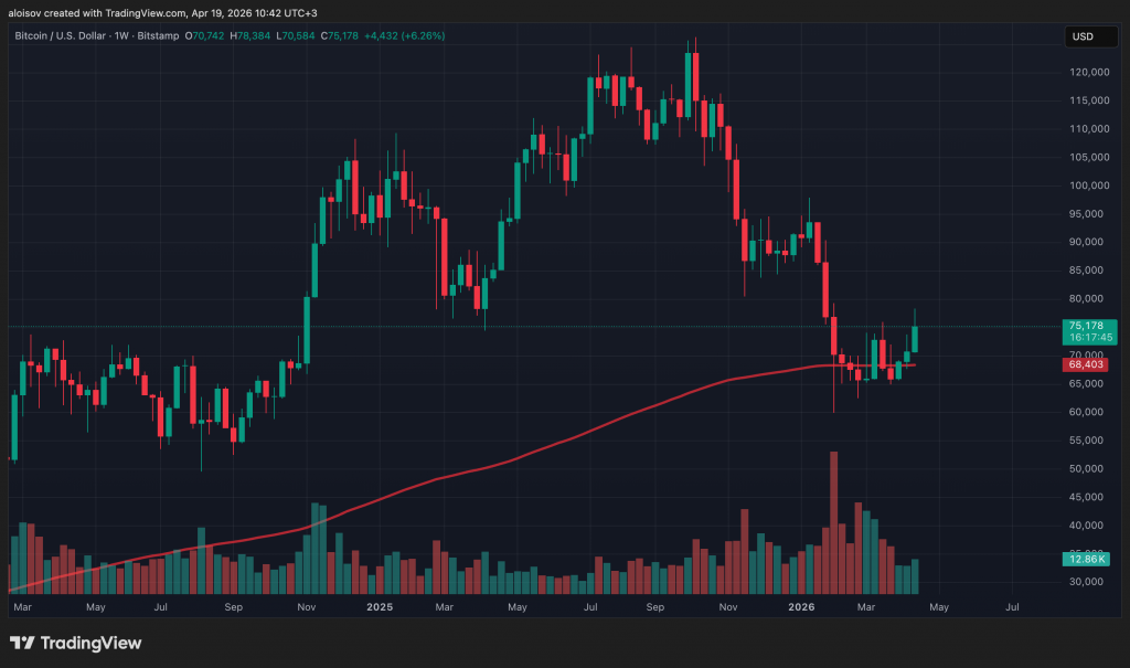 Главным движущим фактором для биткоина на этой неделе стала не фундаментальная аналитика, а дипломатия. После появления информации о переговорах между США и Ираном биткоин приблизился к $75 000, а к концу недели и вовсе пробил $78 000, обновив максимум за десять недель. Попутно были ликвидированы позиции 177 000 трейдеров на сумму $530 млн, из которых около 80% составляли короткие позиции по биткоину и Ethereum.