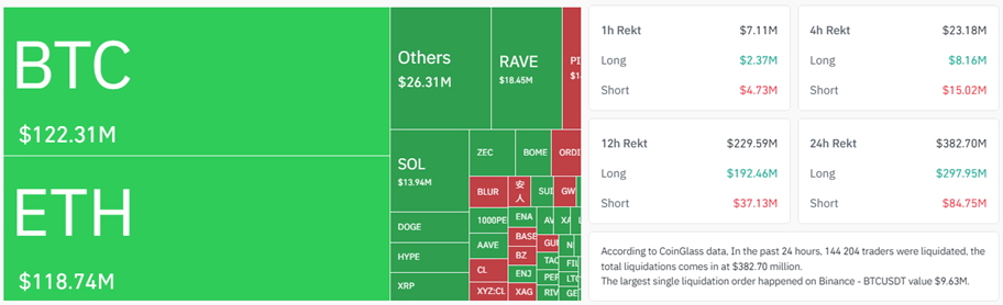 По данным Coinglass, за последние 24 часа ликвидации лонгов по биткоину составили $102,3 млн, шортов — $20 млн.