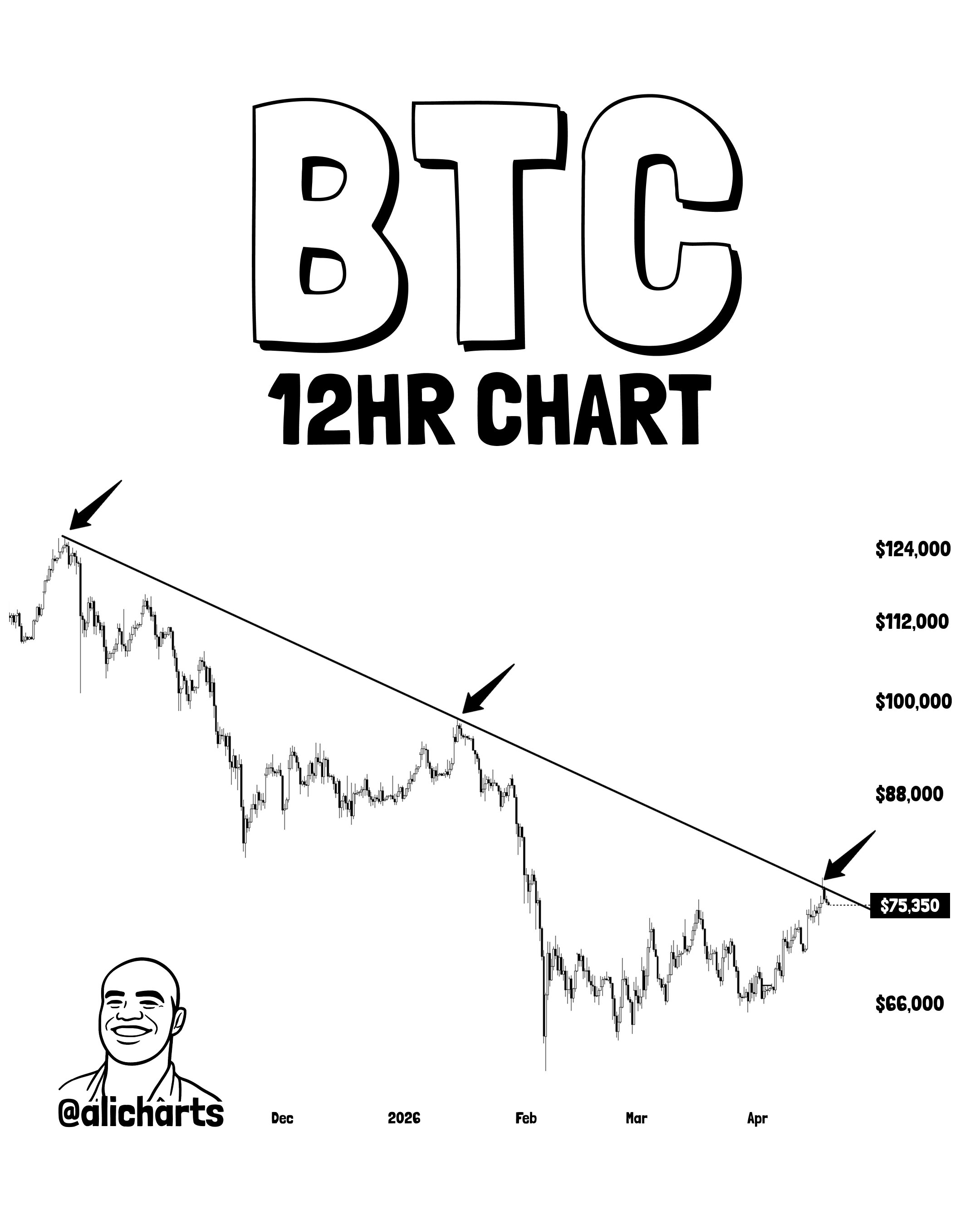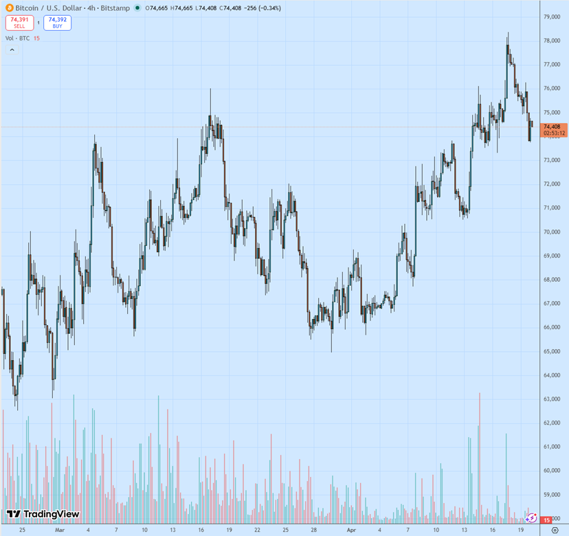19 апреля биткоин ($BTC) продолжил корректировать волну роста к максимумам с февраля После того попытки вернуть котировки выше пройденного вниз месячного пика ($76 000) провалились, негативная динамика возобновилась до следующей локальной поддержки вблизи $73 600. В понедельник утром быки пытаются перехватить инициативу.