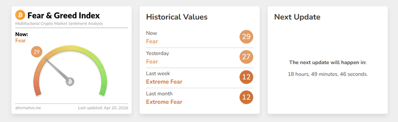 Индекс страха и жадности повысился с 27 до 29 пункта, сохранив позиции в зоне страха.