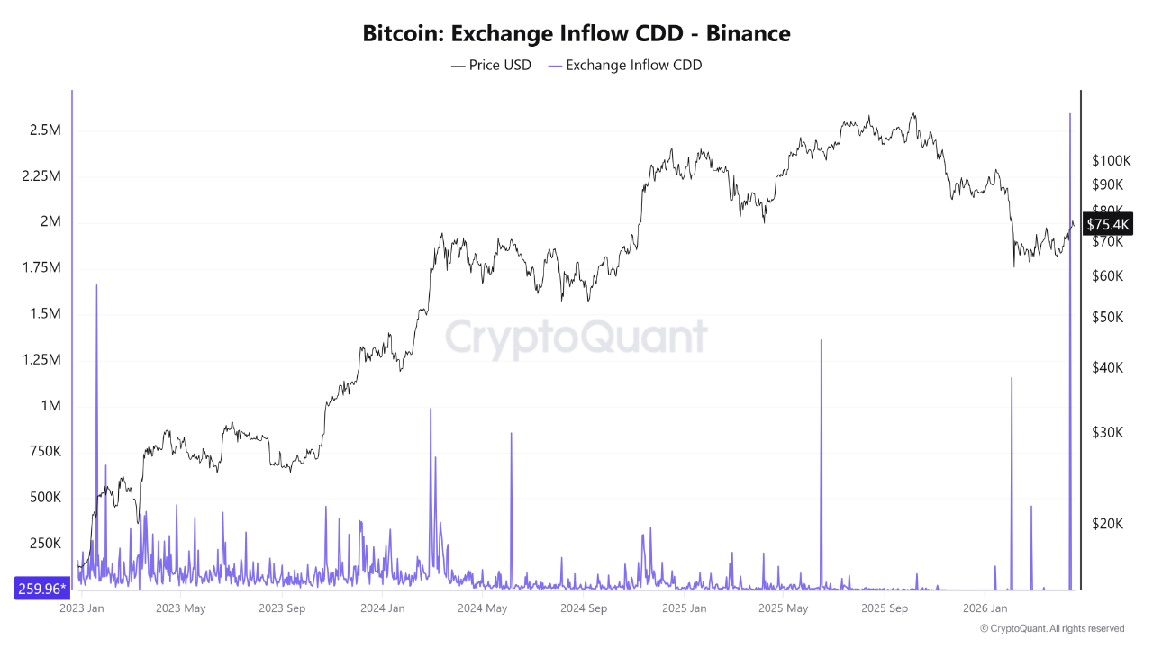 В CryptoQuant указали на скачок метрики CDD достиг самого высокого уровня с начала 2023 года. Индикатор отражает перевод «спящих» монет долгосрочными держателями на биржи для фиксации прибыли. Согласно специалистам, такое поведение создает серьезный барьер сопротивления вблизи $75 000.