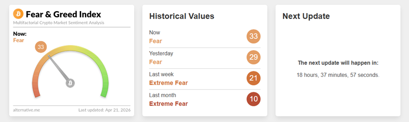 Индекс страха и жадности повысился с 29 до 33 пунктов, сохранив позиции в зоне страха.
