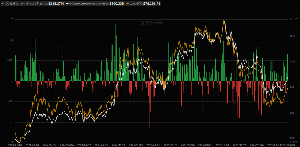 Приток в спотовые $BTC-ETF продолжился пятый день подряд, составив $238,4 млн.