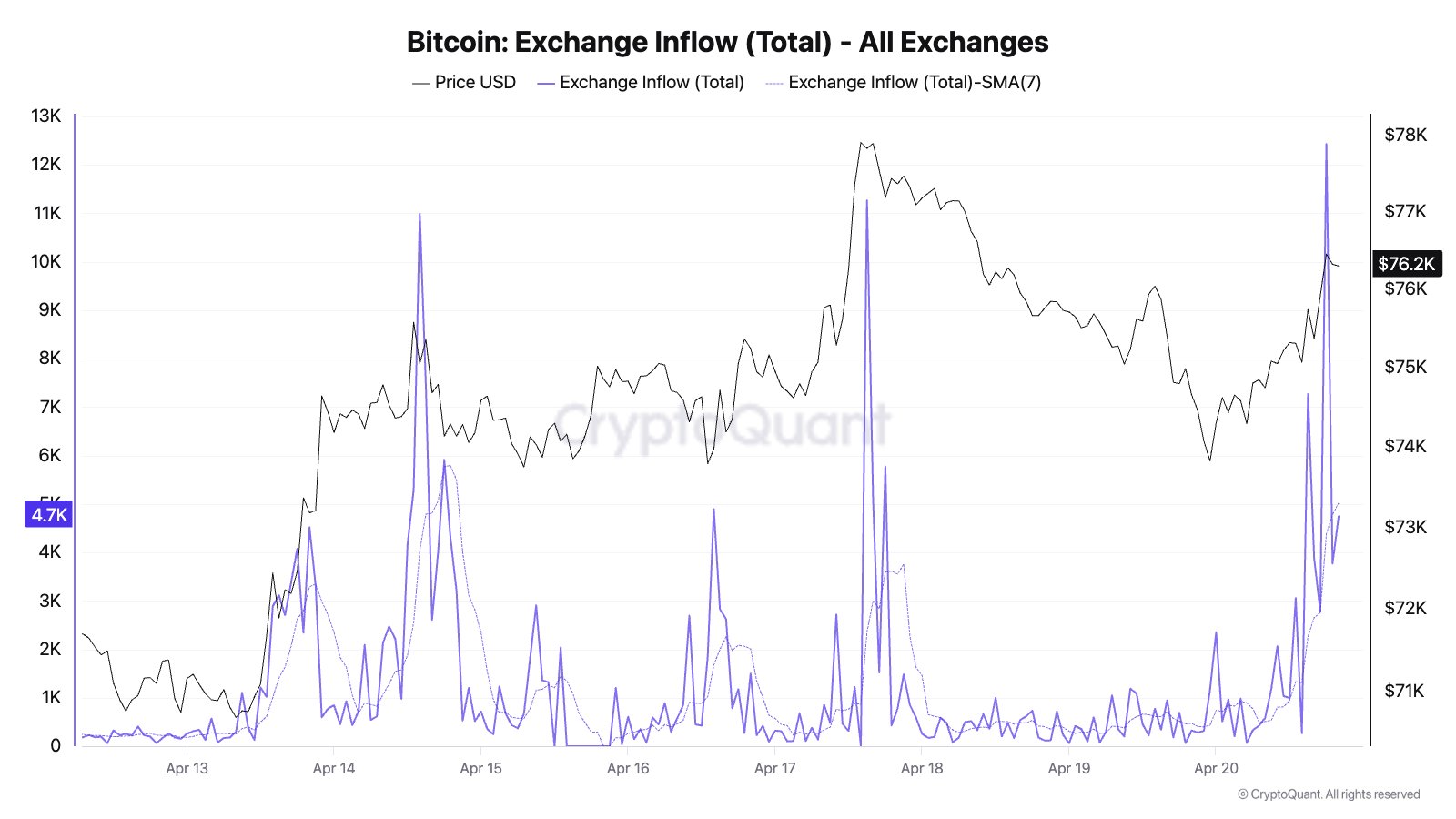 В CryptoQuant продолжили фиксировать всплески переводов монет на централизованные биржи преимущественно на Coinbase с целью их последующей продажи.