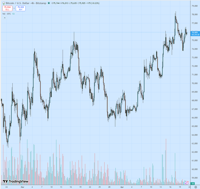 20 апреля биткоин ($BTC) оттолкнулся от локальной поддержки на $74 000 и отскочил к $76 000, где встретил сопротивление. Таким образом появились предпосылки для формирования диапазона с обозначенными границами, который останется актуальным в случае отсутствия новых успехов быков. Во вторник утром котировки перешли к консолидации.