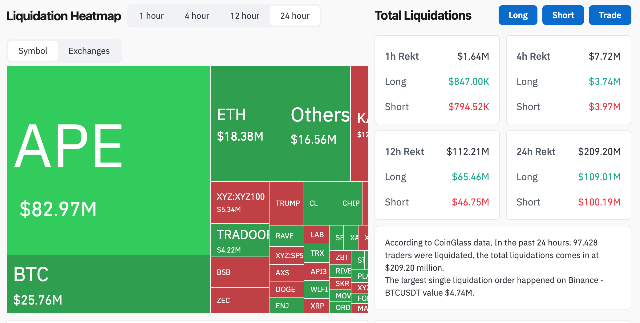 За последние 24 часа была принудительно закрыта 97 501 позиция трейдера. Общий объем ликвидаций составил $209,27 млн.