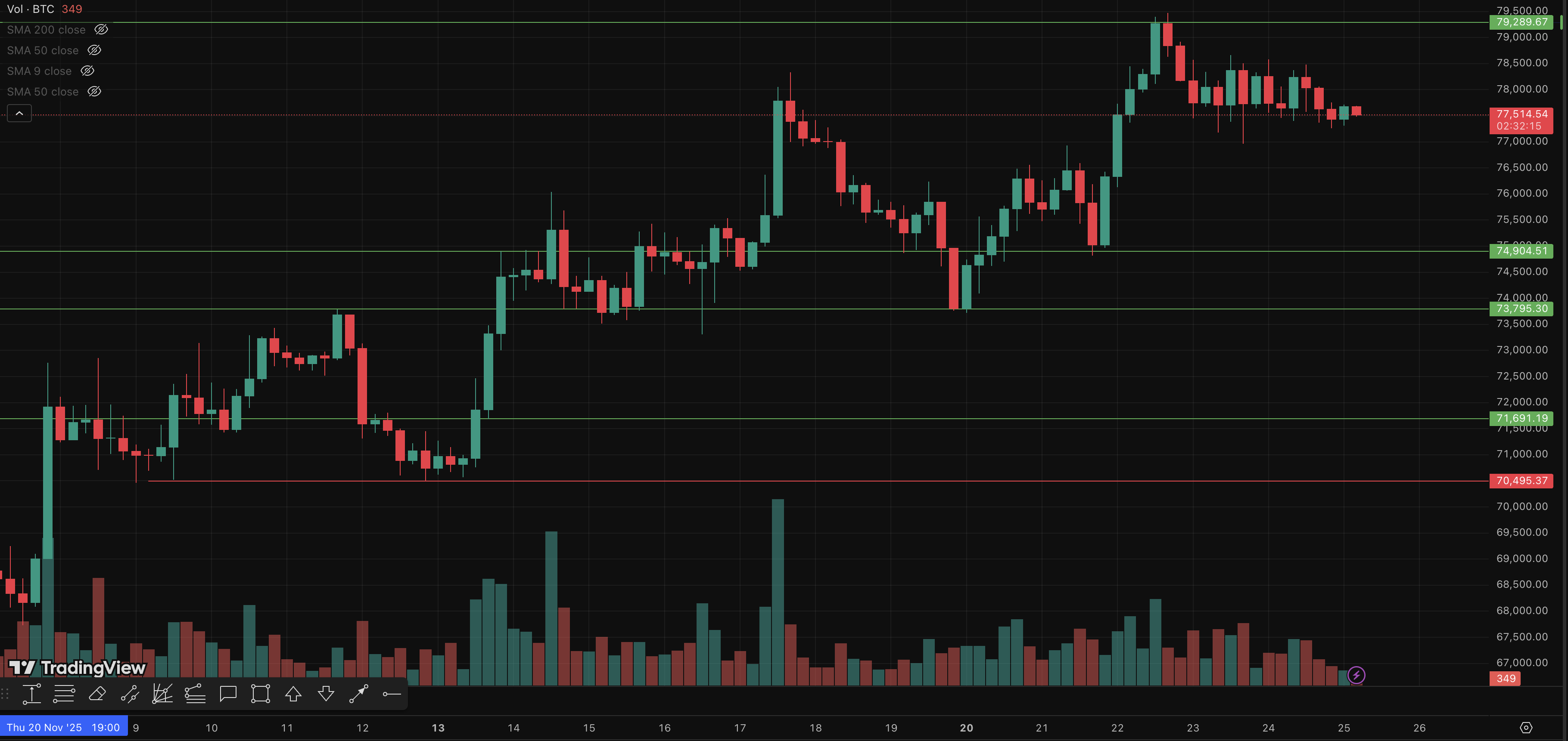 Биткоин торгуется у отметки $77 500, немного отступив от локальных максимумов.