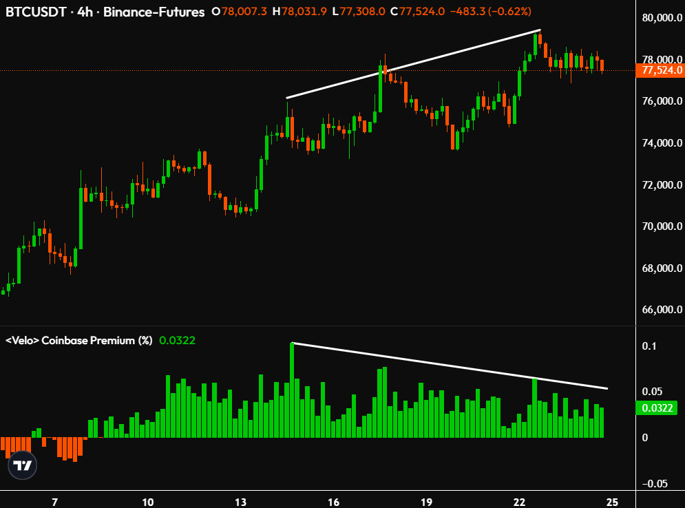 Эксперт Тед Пиллоус отметил, что премия на крупнейшей американской криптобирже снижается на фоне попыток роста цены цифрового золота. По его мнению, это явный сигнал ослабления спотового спроса.