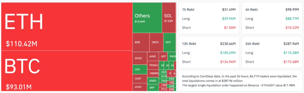 - Сумма ликвидаций на крипторынке составила почти $288 млн.