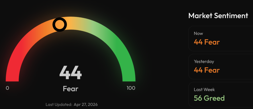 Индекс страха и жадности на рынке криптоактивов составляет 44 пункта, но все еще находится в зоне страха, хотя практически в «нейтральной» зоне. По сравнению с предыдущей неделей показатель упал на 12 пунктов.
