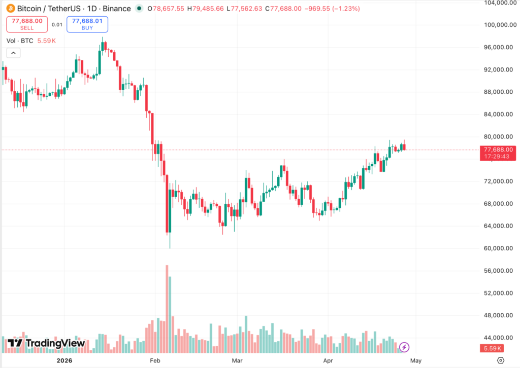 Биткоин торгуется на уровне $77 688, согласно TradingView на момент подготовки материала.