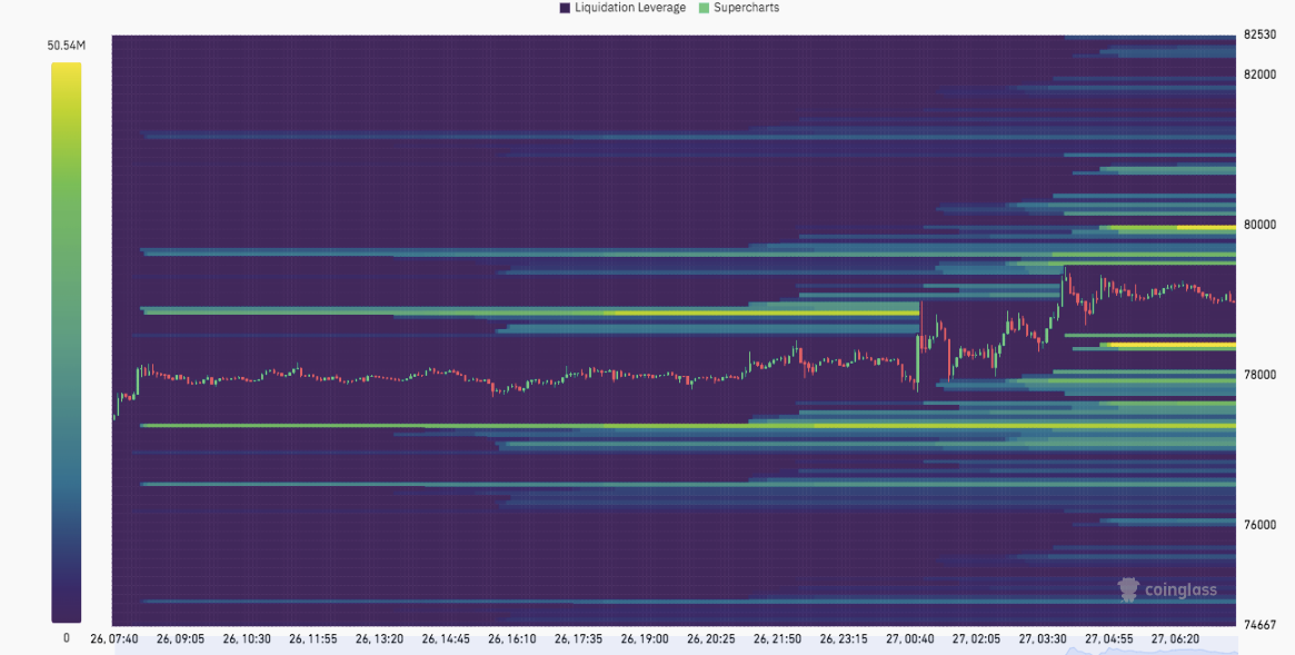 С нисходящей стороны, основные ликвидные зоны остаются ниже $77,000, что указывает на возможные зоны поддержки, где можно будет расчистить длинные позиции. Движение цен в наблюдаемый период показывает устойчивый восходящий тренд ниже $78,000 к диапазону $79,000–$80,000 с краткосрочные колебания.