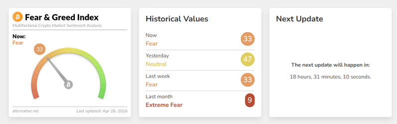 Индекс страха и жадности обратно провалился в зону страха, потеряв 14 пунктов (снижение с 47 до 33 пунктов).