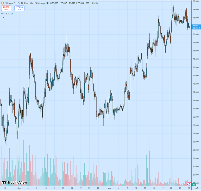 Биткоин вернулся к $77 000 после неудачи в пробое максимума с февраля на $79 500.