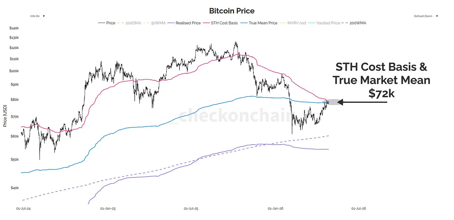 В Checkonchain обратили внимание, что вблизи $79 000 происходит сближение метрик «себестоимости» монет краткосрочных инвесторов и держателей $BTC–ETF, а также True Market Mean. Прохождение ценой выше индикаторов способно изменить психологию.