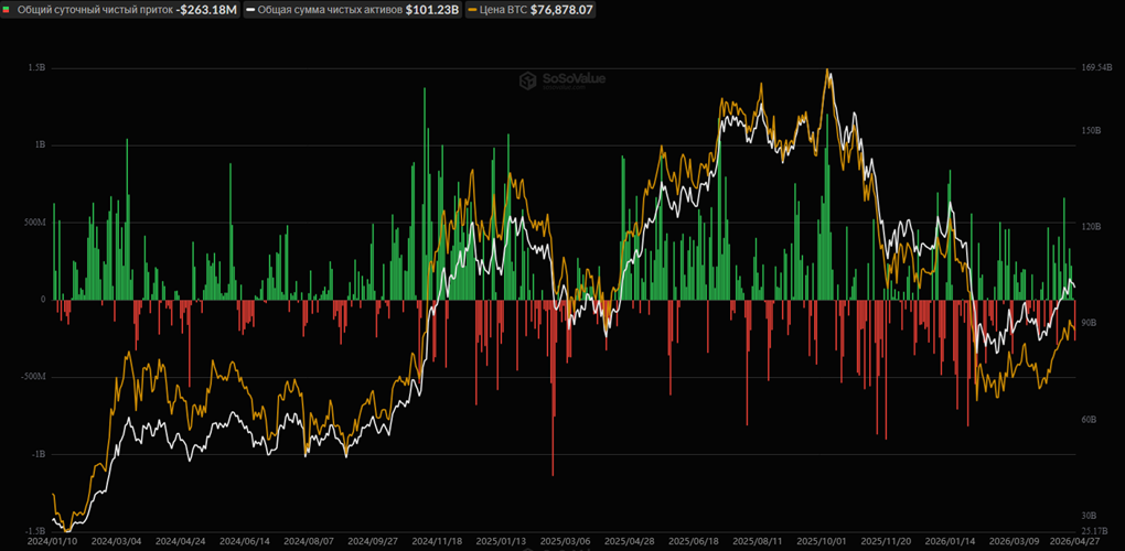 Приток в спотовые $BTC-ETF прервался спустя десять дней. Отток достиг $263,3 млн.