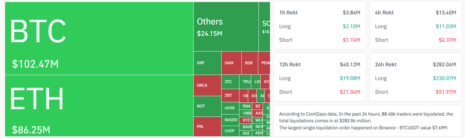 По данным Coinglass, за последние 24 часа ликвидации лонгов по биткоину составили $92,4 млн, принудительные закрытия шортов — $10 млн.