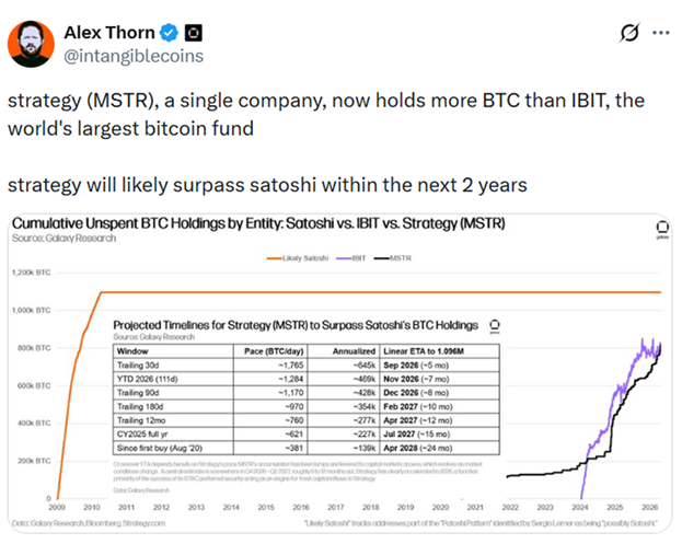 При сохранении нынешних темпов покупок Strategy опередит создателя биткоина по объему удерживаемых монет в течение следующих двух лет. Такими перспективами поделился руководитель отдела исследований в Galaxy Digital Алекс Торн.